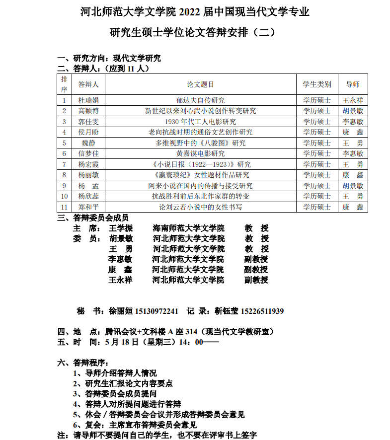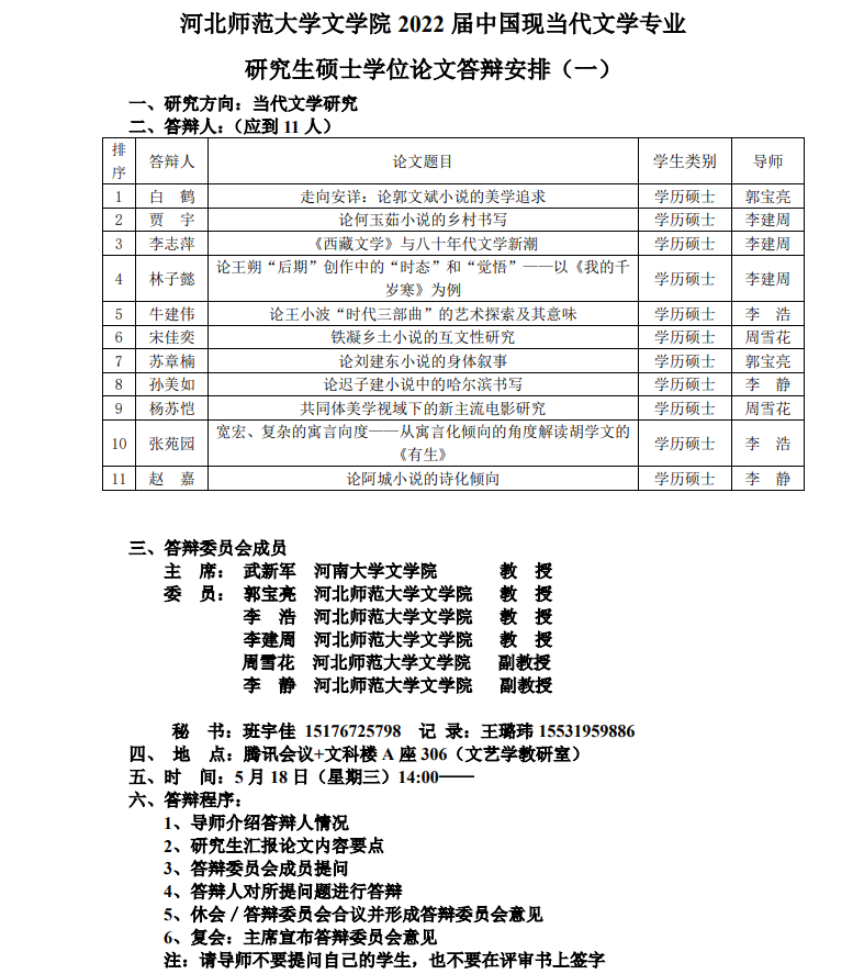 2022届中国现当代文学博士硕士研究生学位论文答辩安排(18日答辩)