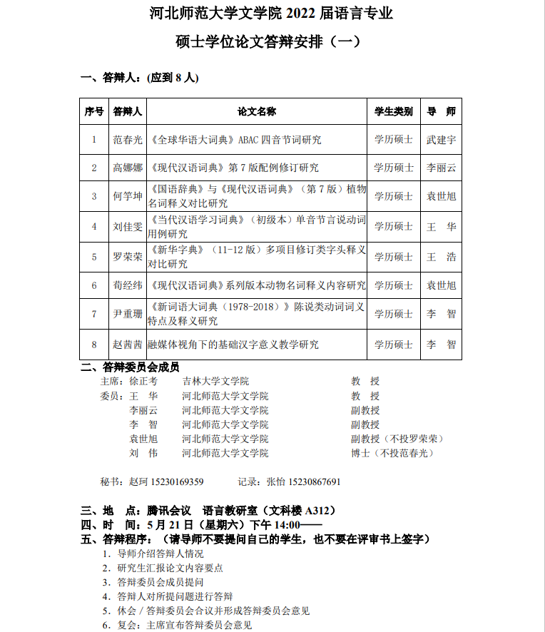 2022届语言学硕士研究生学位论文答辩安排(21日答辩)